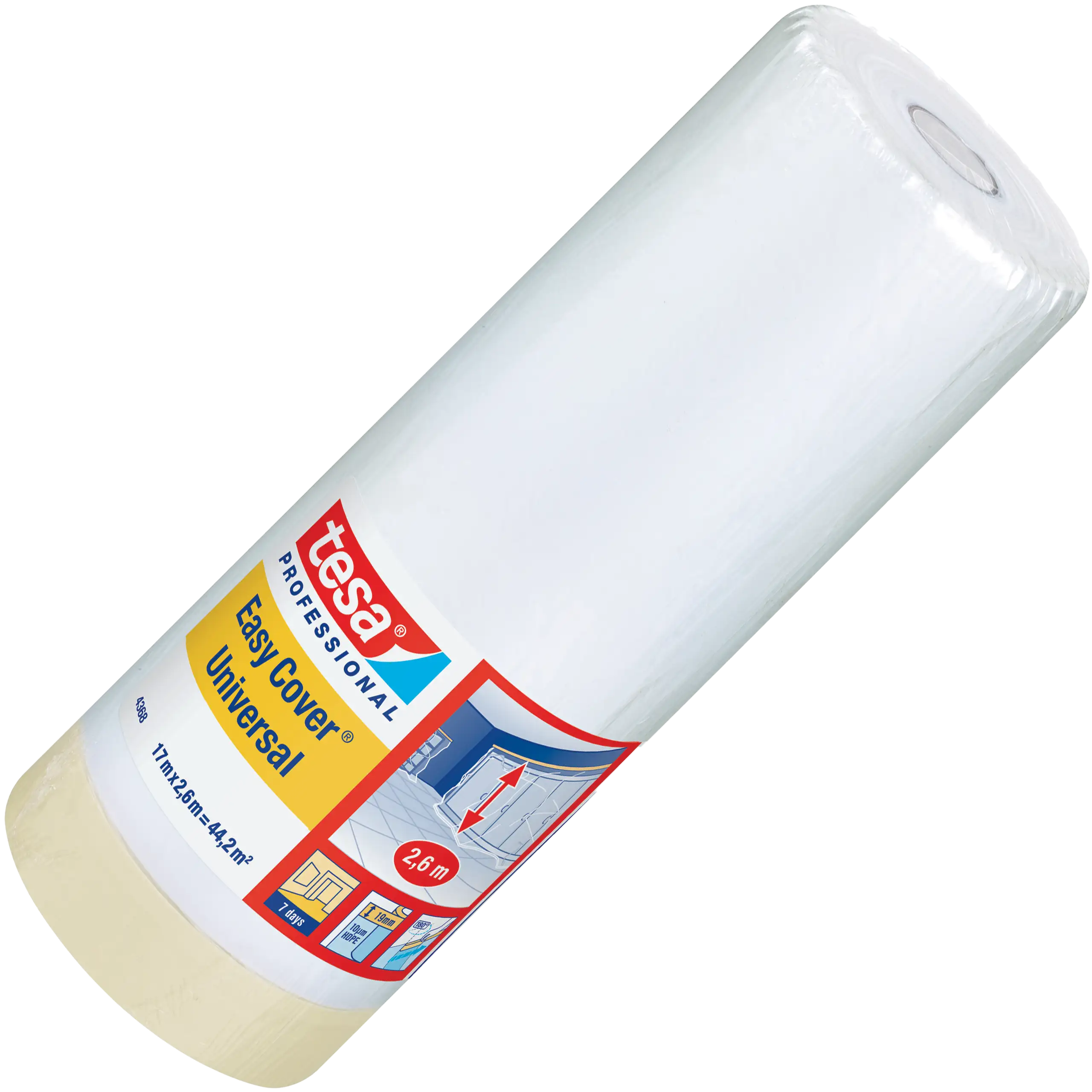 tesa® Easy Cover Universal 4368 łączy elastyczny papier krepowany z folią HDPE oraz taśmą malarską o mocnej przyczepności. Dzięki temu umożliwia szybkie zabezpieczenie dużych powierzchni przed malowaniem, gwarantując czyste krawędzie i ochronę podłoża.