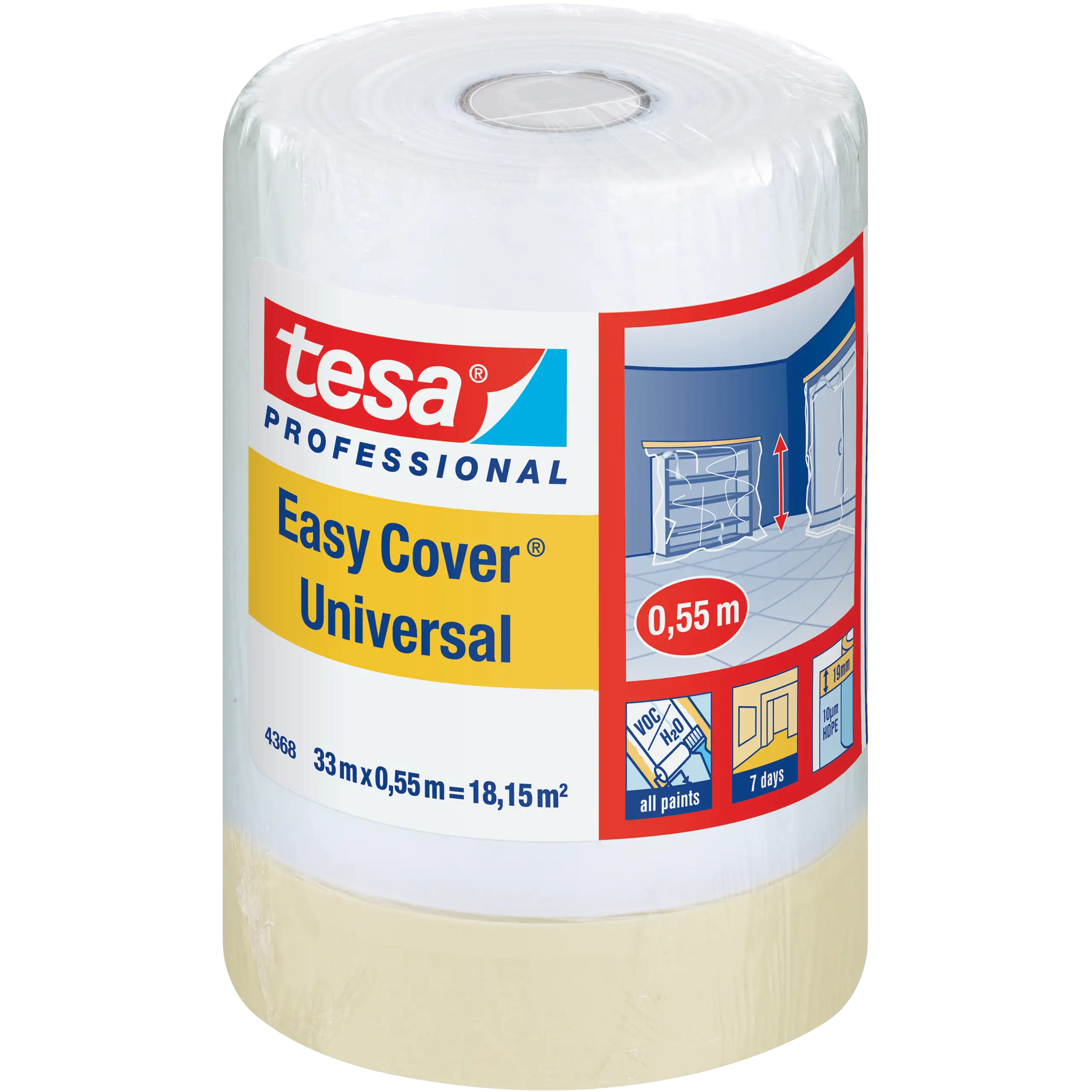 tesa® Easy Cover Universal 4368 łączy elastyczny papier krepowany z folią HDPE oraz taśmą malarską o mocnej przyczepności.