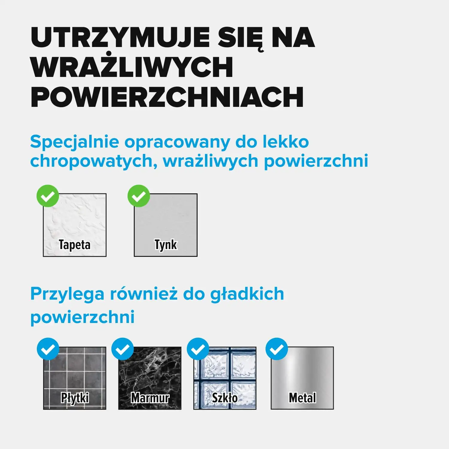 Zaprojektowana specjalnie do fakturowanych i wrażliwych podłoży, takich jak tapeta czy tynk. Dzięki temu zapewnia pewne mocowanie bez ryzyka zniszczenia powierzchni – zarówno podczas użytkowania, jak i przy usuwaniu.