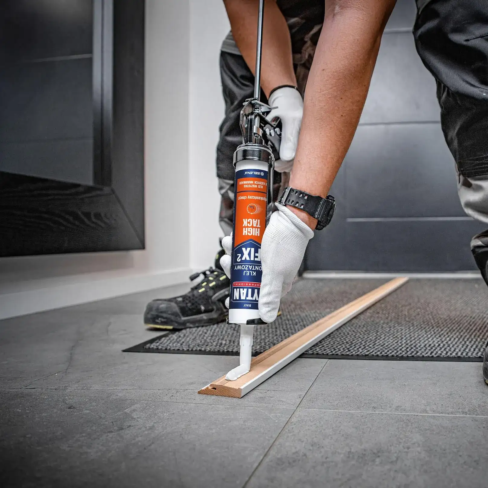 Klej montażowy TYTAN Professional FIX² High Tack zapewnia natychmiastowy chwyt początkowy w ciągu 1 sekundy, co pozwala na montaż elementów nawet na powierzchniach pionowych bez konieczności podpierania.