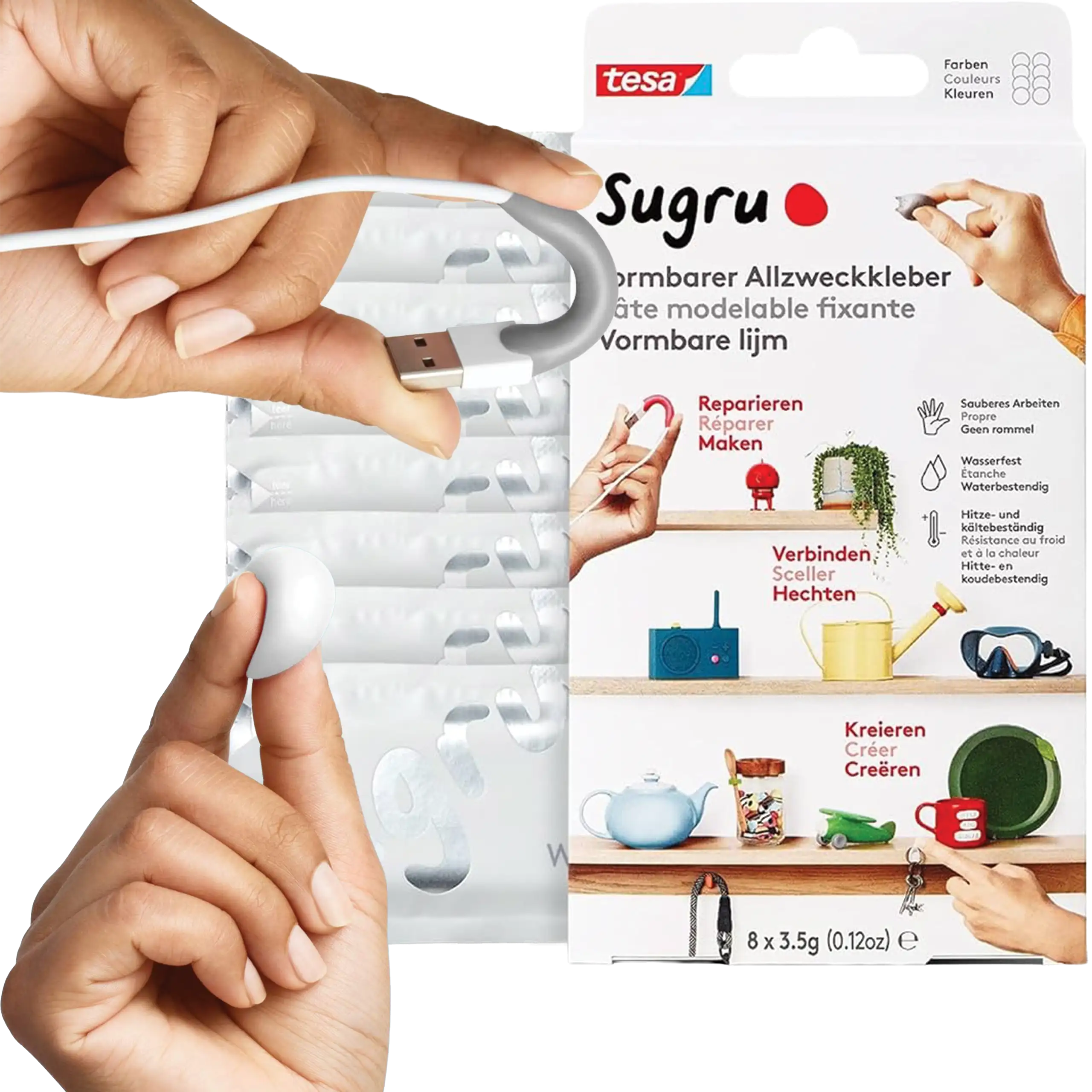 Po utwardzeniu Sugru staje się trwałym materiałem silikonowym odpornym na czynniki zewnętrzne, wodę, temperatury i wstrząsy. Nie traci właściwości z upływem czasu, dzięki czemu naprawione lub zmodyfikowane elementy pozostają stabilne na lata. Idealny do zastosowań domowych, warsztatowych i renowacyjnych.