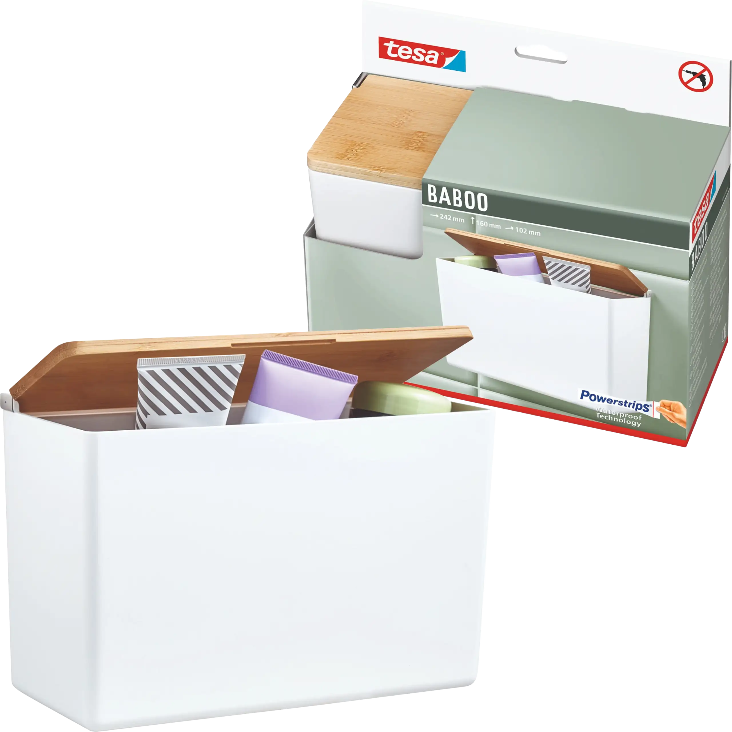Dzięki technologii tesa® Powerstrips Waterproof montaż jest szybki, czysty i nie wymaga narzędzi. Organizer można przymocować na płytkach, marmurze, szkle czy metalu, a po usunięciu nie pozostawia żadnych śladów. To szczególnie wygodne rozwiązanie dla osób ceniących mobilność i elastyczność – pudełko można łatwo zdemontować i ponownie zamontować w innym miejscu.