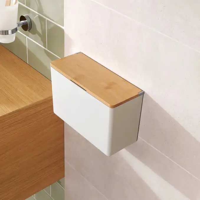 Pudełko tesa® Baboo łączy wysokiej jakości matowe tworzywo z naturalną bambusową pokrywką, tworząc nowoczesny i jednocześnie ciepły akcent w łazience.