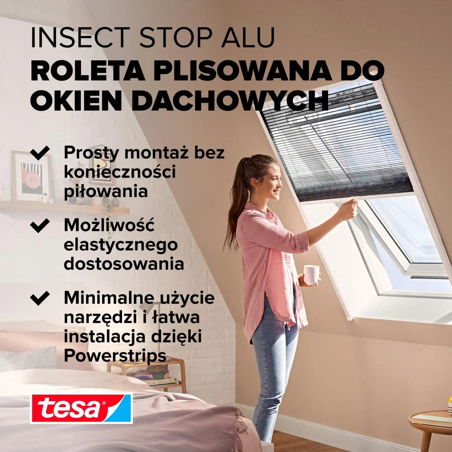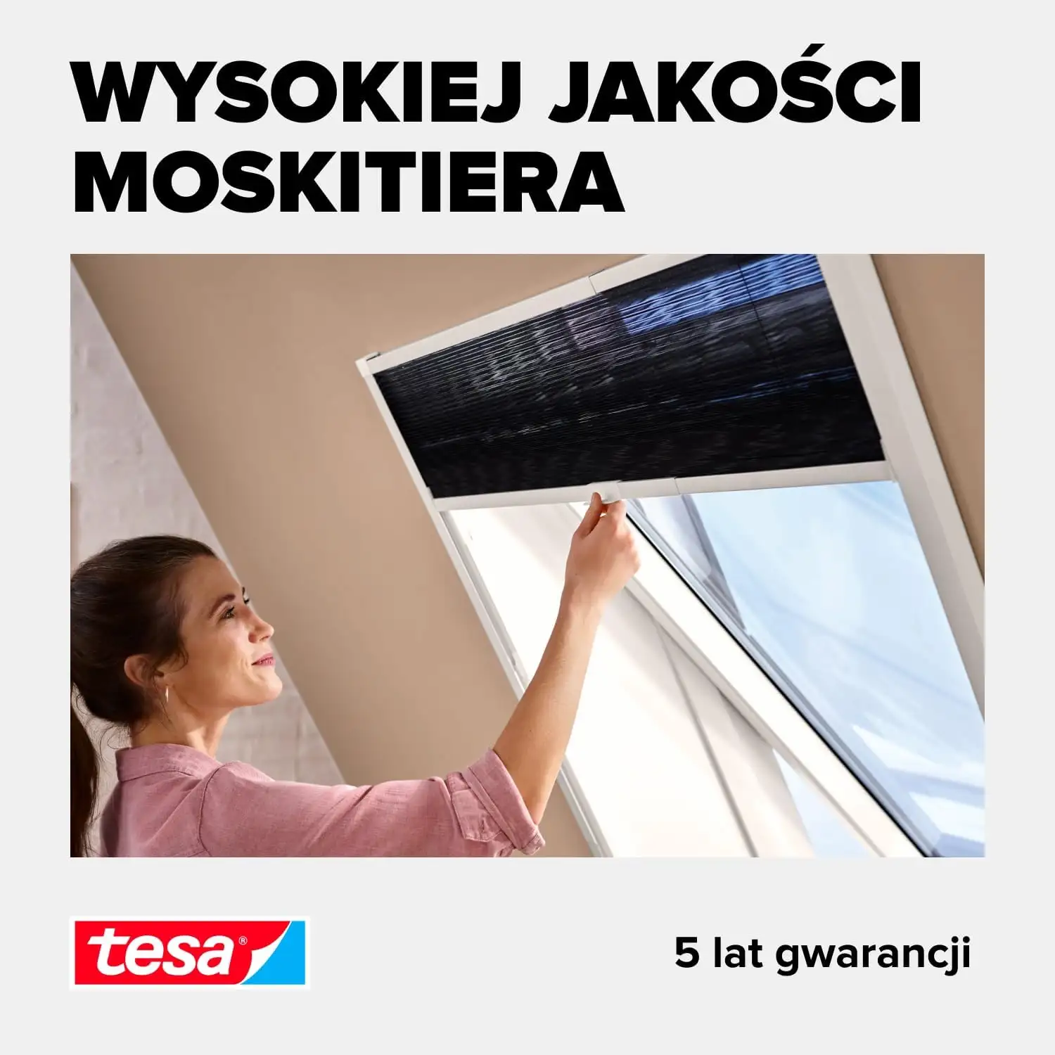 Moskitiera tesa® do okien dachowych została zaprojektowana tak, aby jej montaż był szybki i wygodny. Dzięki plastrom montażowym tesa Powerstrips® można ją zamocować bez wiercenia w ramie okna. Nie są potrzebne żadne narzędzia, co znacząco skraca czas instalacji. Wymagane jest jedynie stabilne i solidne podłoże, aby zapewnić trwałe mocowanie.