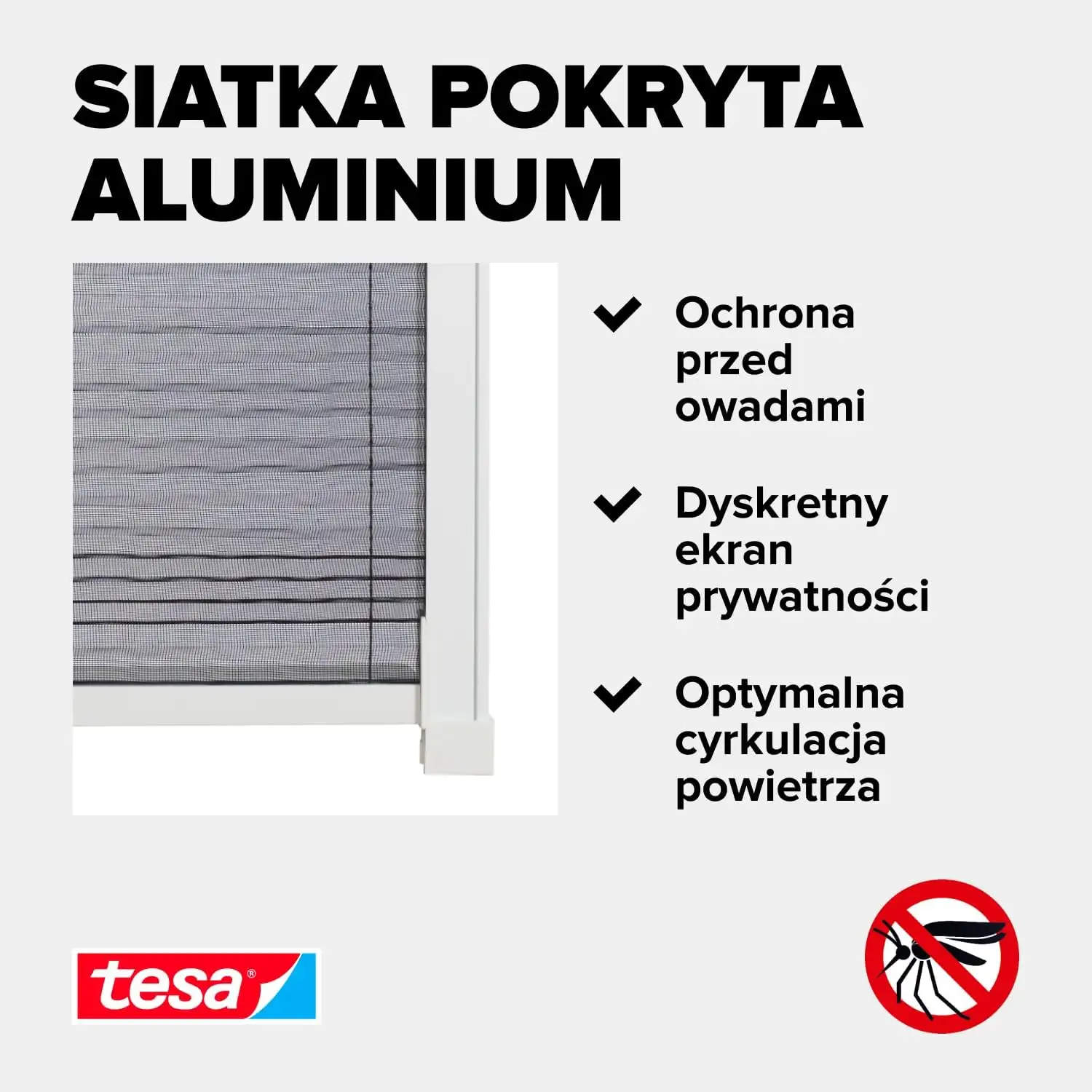 Plisowana siatka skutecznie chroni wnętrze przed muchami, komarami i innymi owadami, jednocześnie umożliwiając swobodny przepływ powietrza. Aluminiowa konstrukcja zapewnia trwałość oraz estetyczny wygląd dopasowany do nowoczesnych wnętrz. Elegancki biały kolor sprawia, że moskitiera dobrze komponuje się z większością aranżacji. Produkt objęty jest 5-letnią gwarancją, co potwierdza jego wysoką jakość i niezawodność.