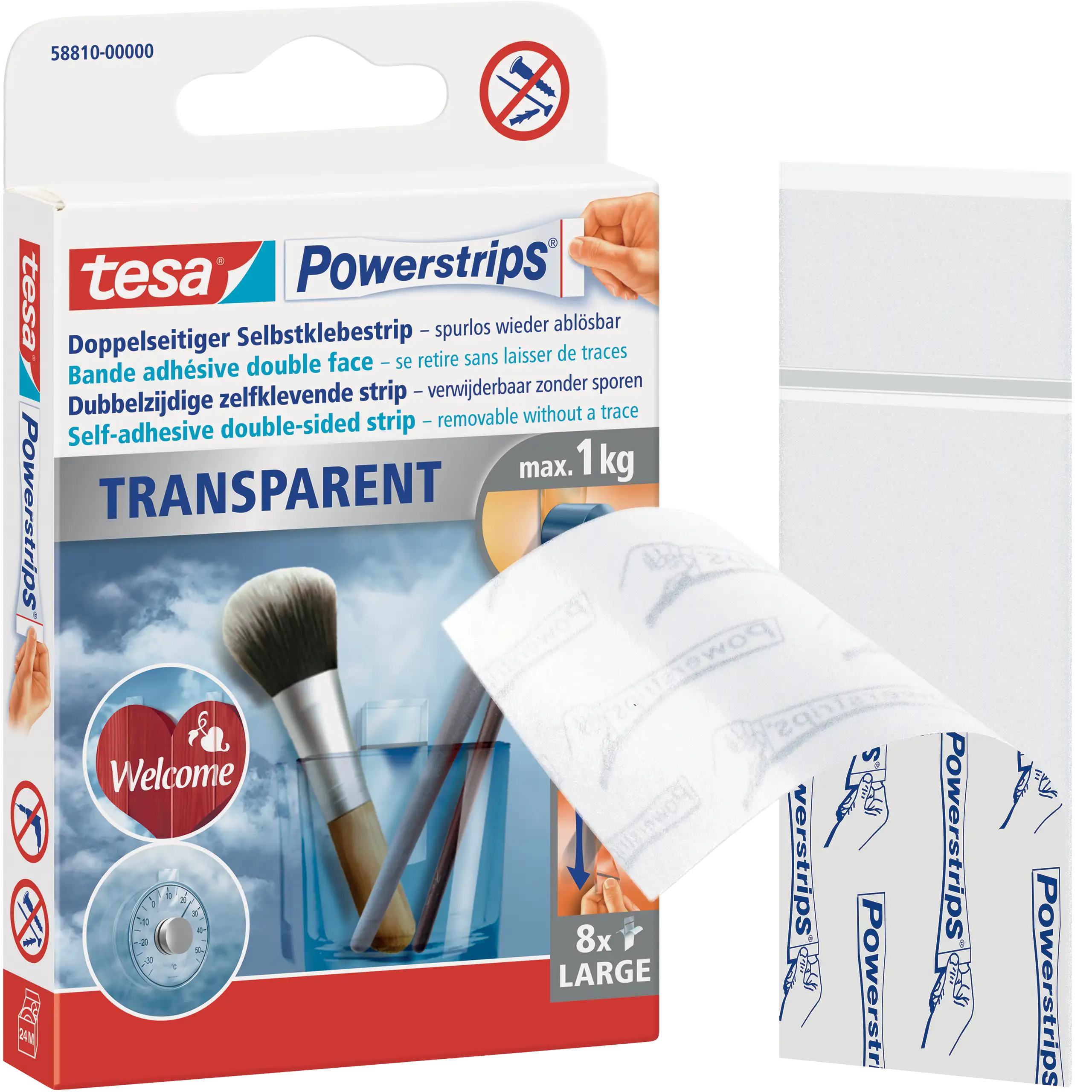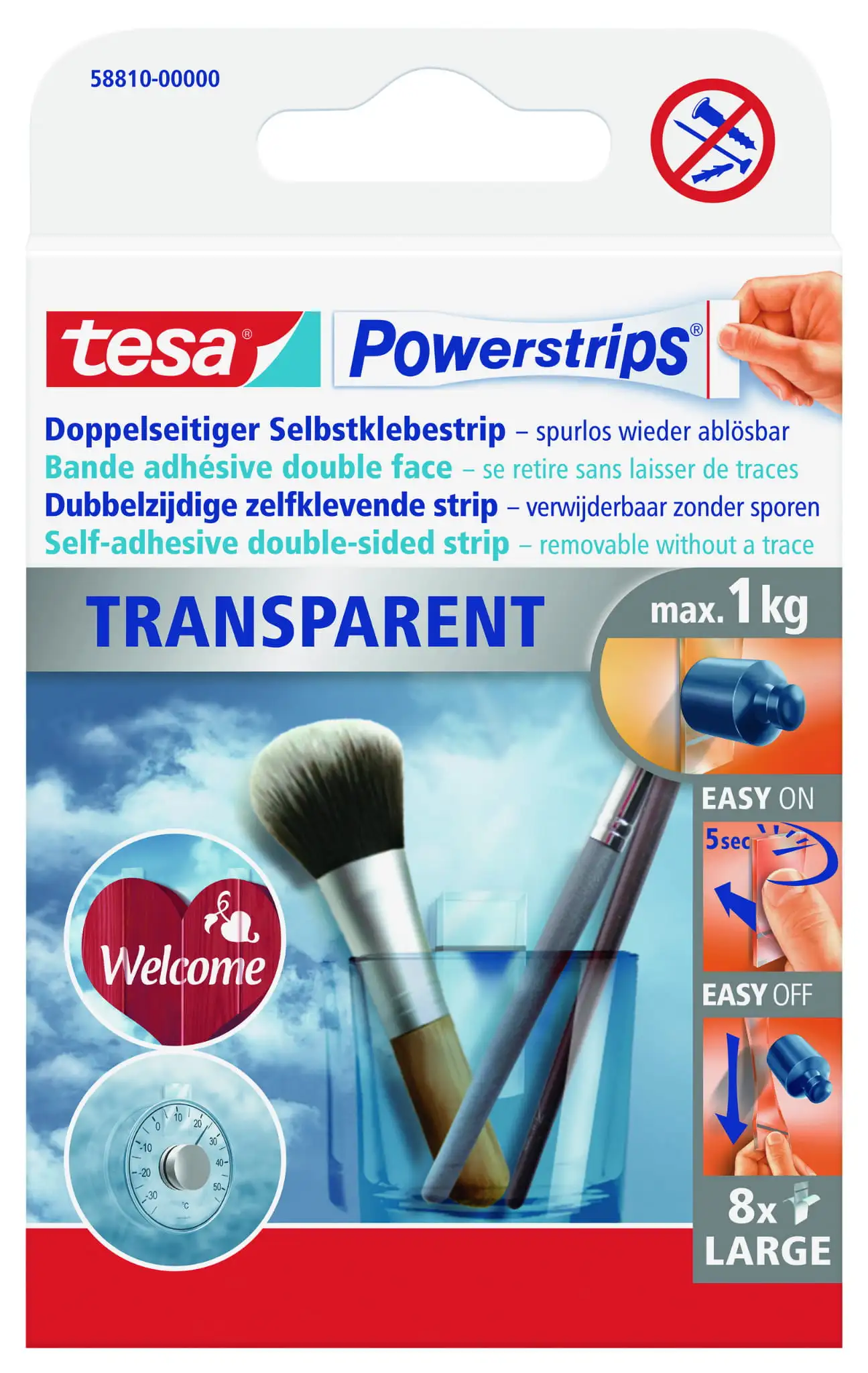 Plastry tesa® Powerstrips przezroczyste umożliwiają niewidoczne mocowanie lekkich przedmiotów, idealne do dekoracji szklanych i przezroczystych powierzchni.