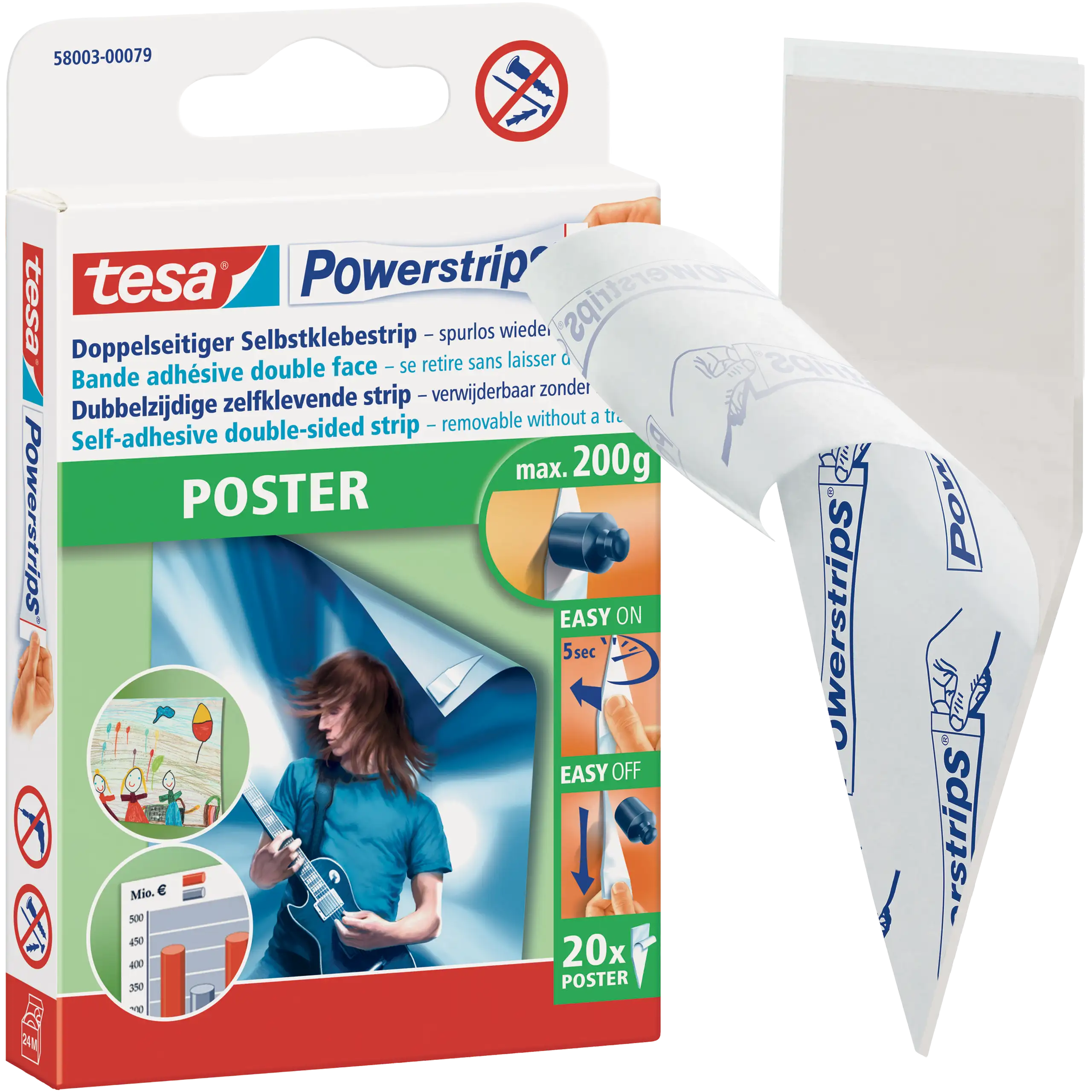 Plastry tesa® Powerstrips do plakatów umożliwiają mocowanie lekkich przedmiotów , takich jak plakaty czy rysunki, bez ryzyka uszkodzenia ściany czy samego materiału.