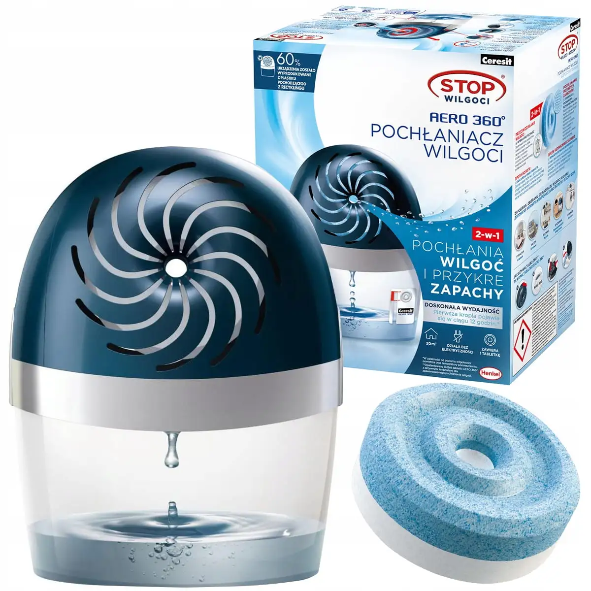 Dzięki aerodynamicznemu kształtowi oraz wymiennej tabletce AERO 360° z centralnym otworem i rowkami, urządzenie zapewnia cyrkulację powietrza w 360°, co zwiększa efektywność pochłaniania wilgoci. System działa na zasadach fizyki – większa powierzchnia kontaktu tabletki z powietrzem oznacza lepsze wyniki w pochłanianiu nadmiaru wilgoci.
