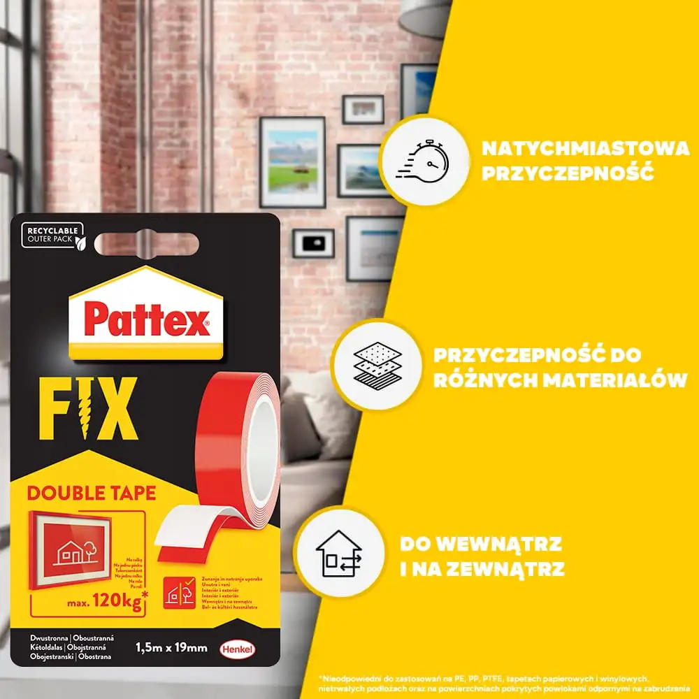 Pattex FIX 120 kg to wyjątkowo mocna taśma montażowa, której siła dorównuje tradycyjnym metodom mocowania jak śruby czy wkręty. Jedna rolka taśmy jest w stanie utrzymać aż do 120 kg, co sprawia, że możesz bezpiecznie mocować nawet cięższe przedmioty bez wiercenia.