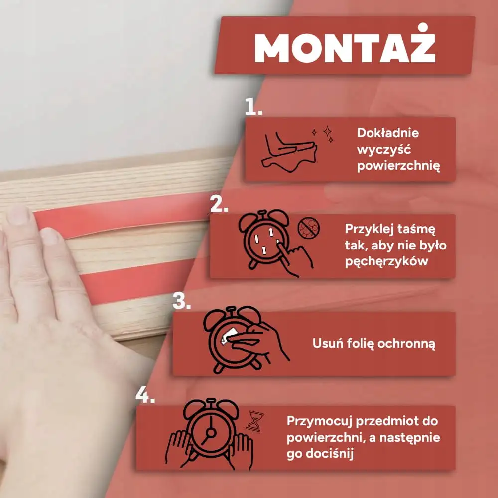 Nie musisz być fachowcem ani posiadać elektronarzędzi. Taśma umożliwia czysty i szybki montaż bez kurzu, hałasu i brudu. To idealne rozwiązanie dla każdego, kto chce coś przymocować, nie uszkadzając ścian czy mebli.