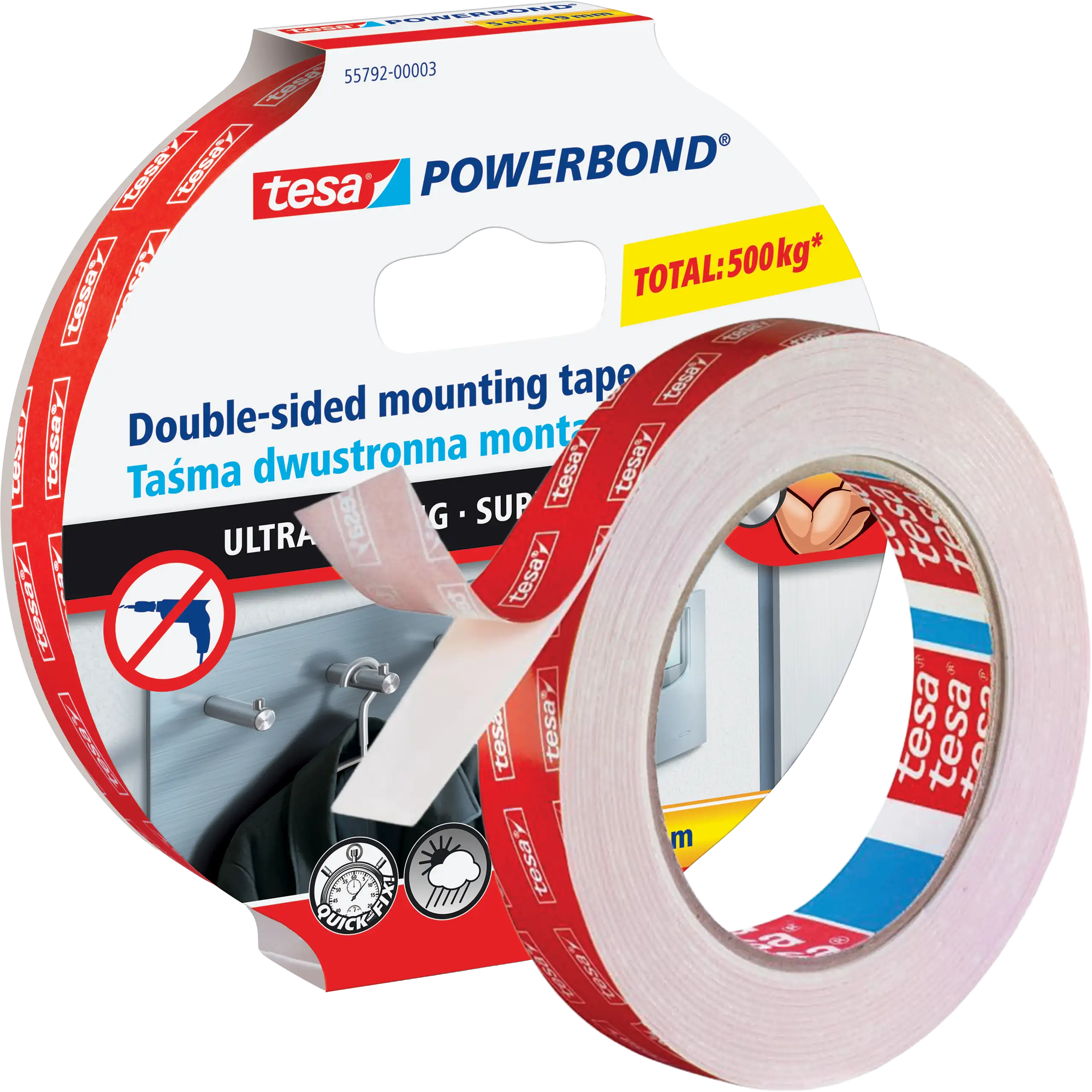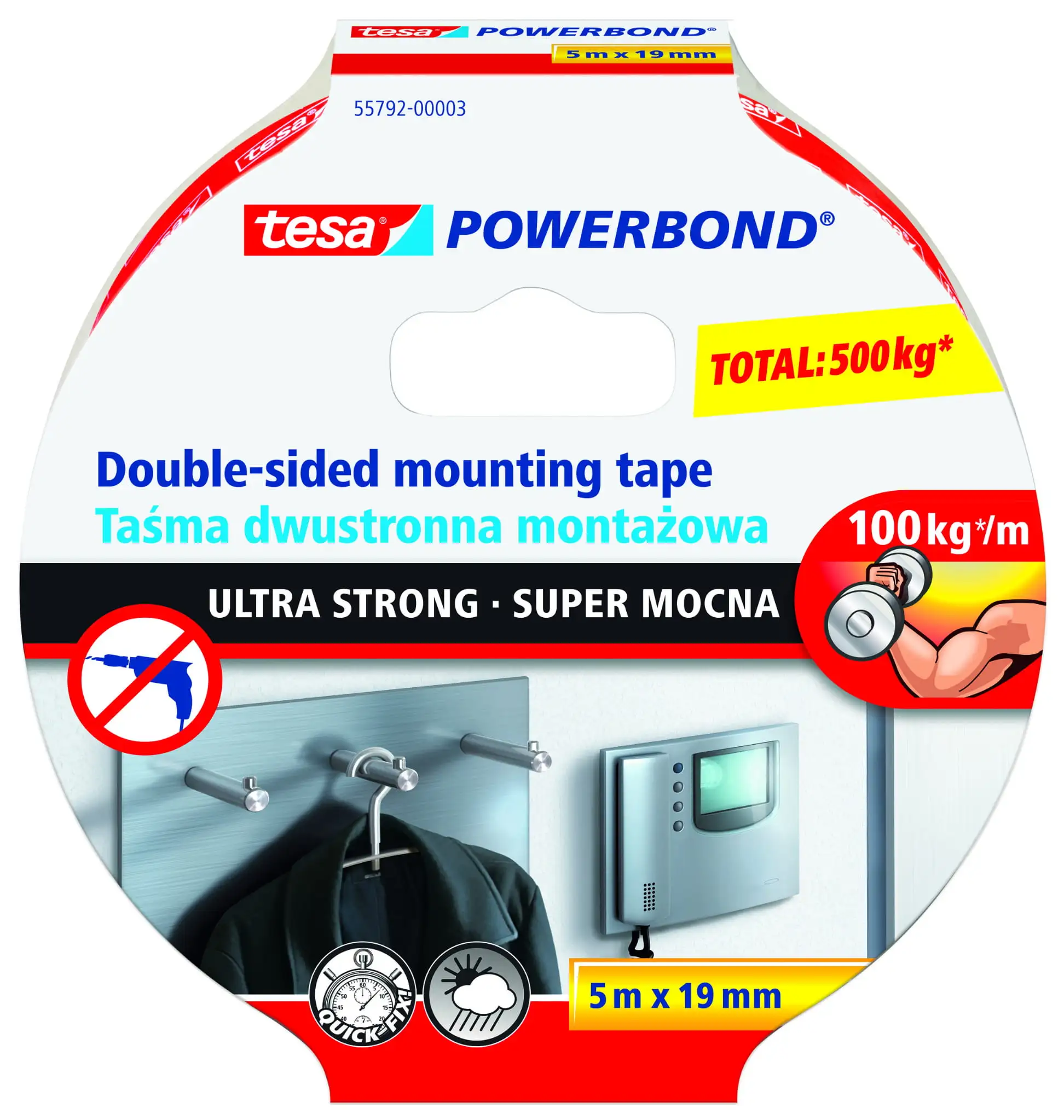 Taśma tesa® Powerbond Super Mocna to doskonała alternatywa dla śrub, gwoździ i wiertarki. Dzięki imponującej sile klejenia – aż do 10 kg na 10 cm taśmy – pozwala trwale mocować nawet cięższe przedmioty .