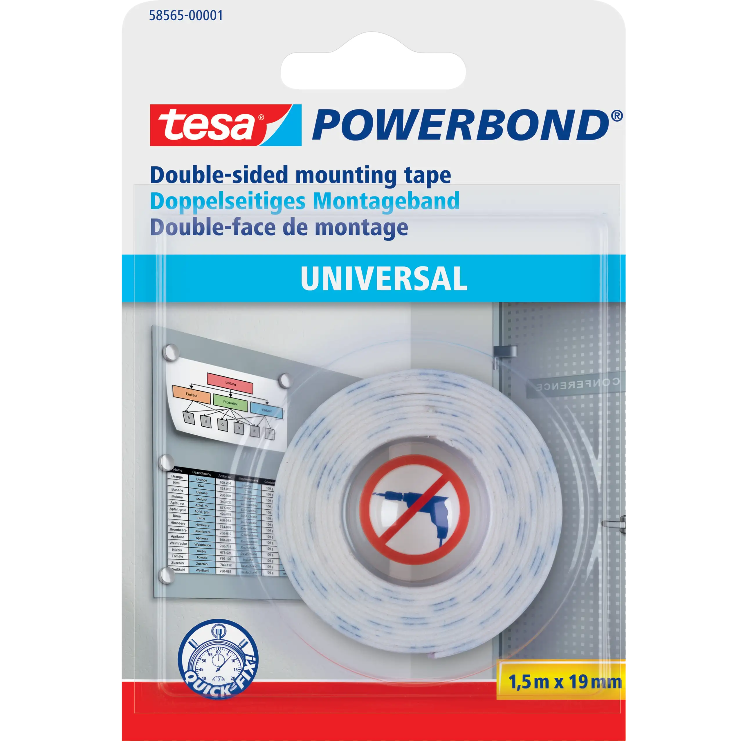 Taśma tesa® Powerbond Uniwersalna zapewnia bezpieczne i trwałe mocowanie lekkich, płaskich przedmiotów w pomieszczeniach. Dzięki wytrzymałej piance PE taśma dopasowuje się do podłoża, gwarantując stabilność i niezawodność przy codziennym użytkowaniu.