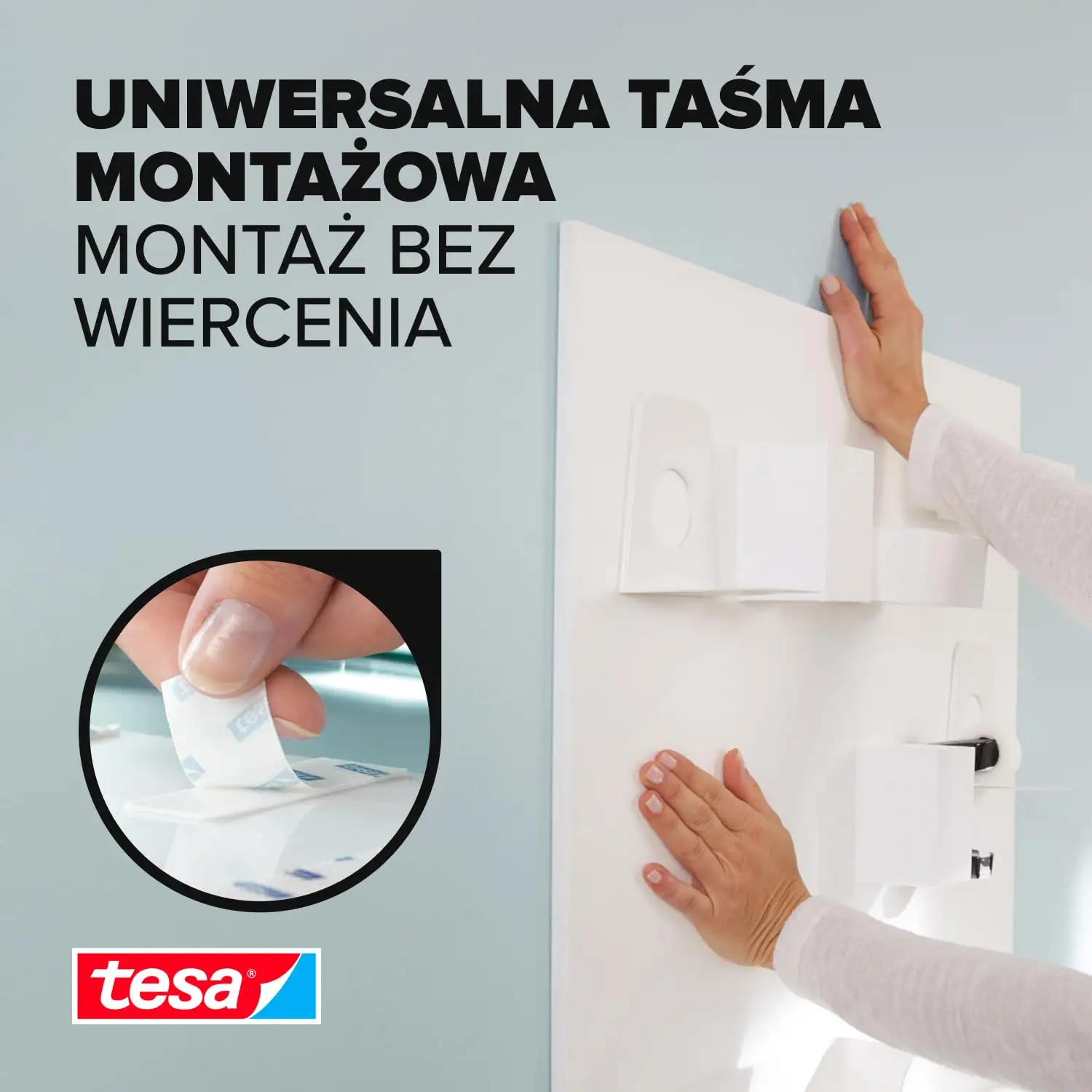 Taśma tesa® Powerbond Uniwersalna zapewnia bezpieczne i trwałe mocowanie lekkich, płaskich przedmiotów w pomieszczeniach.