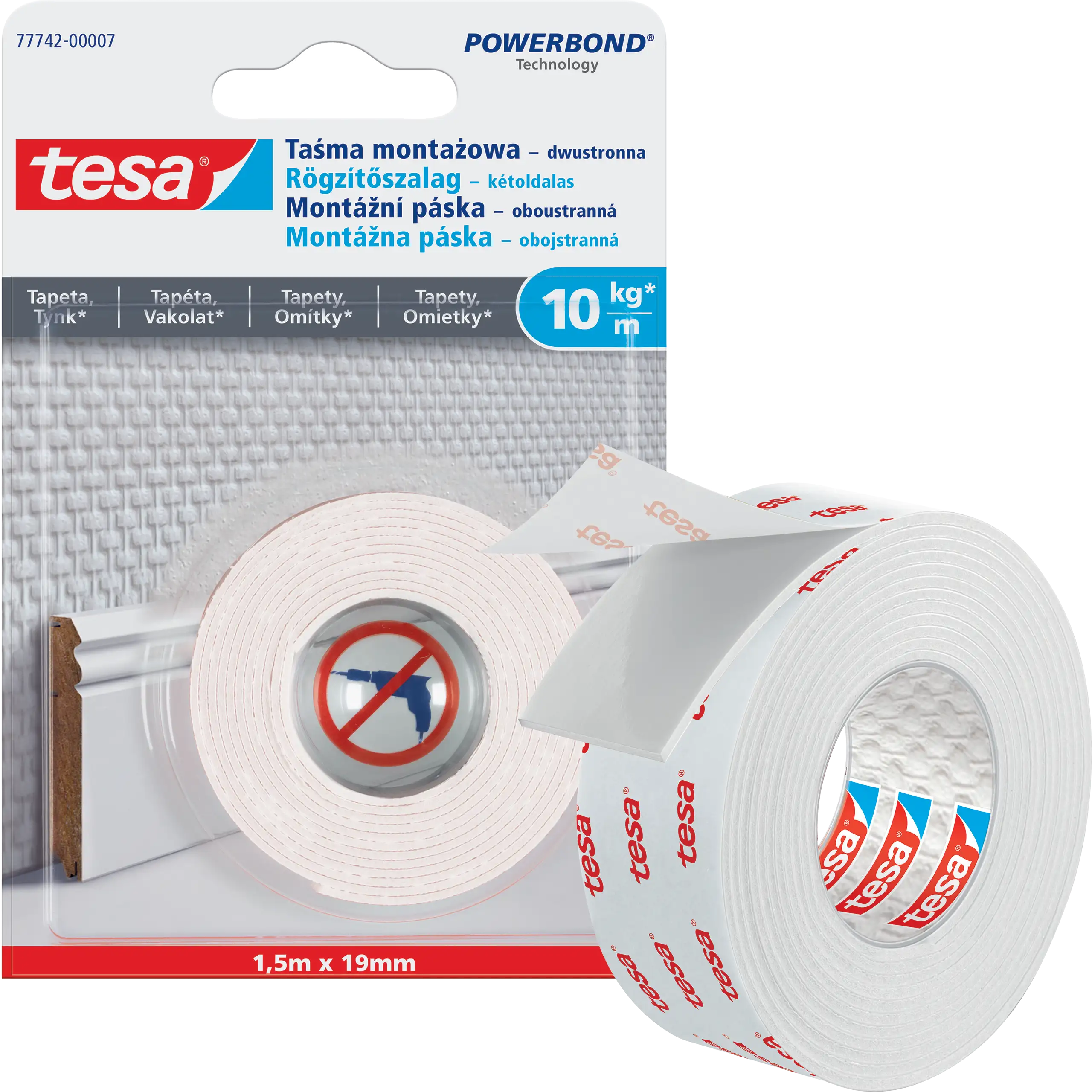 Taśma tesa® do tapet i tynku została zaprojektowana do mocowania lekkich przedmiotów na powierzchniach fakturowanych i delikatnych. Dzięki elastycznej piance PE dopasowuje się do nierówności, zapewniając trwałe i bezpieczne mocowanie, nawet przy nierównych podłożach.