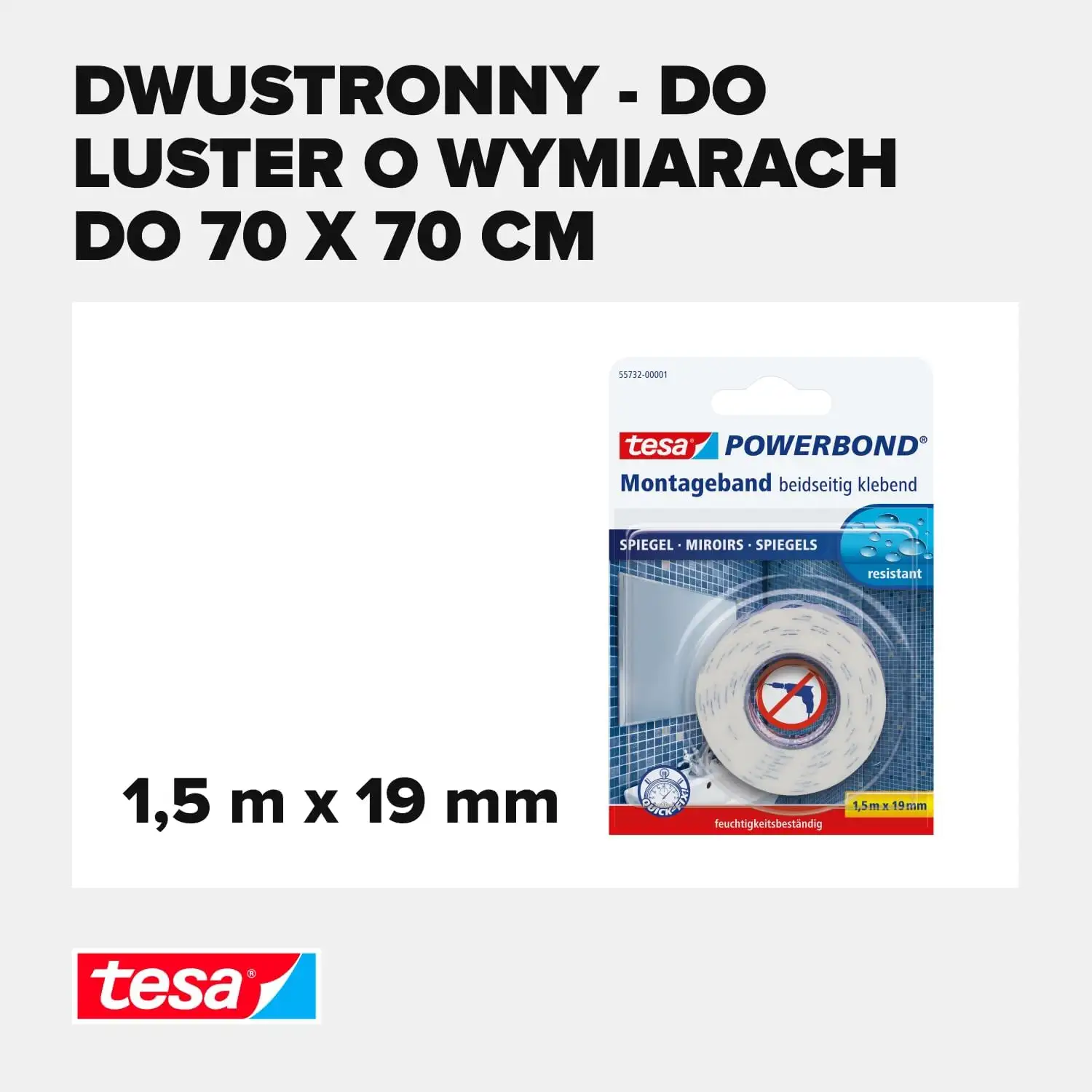 Dwustronna taśma montażowa tesa® Powerbond zapewnia wyjątkową siłę klejenia , pozwalając zamontować lustra bez użycia śrub czy kołków .