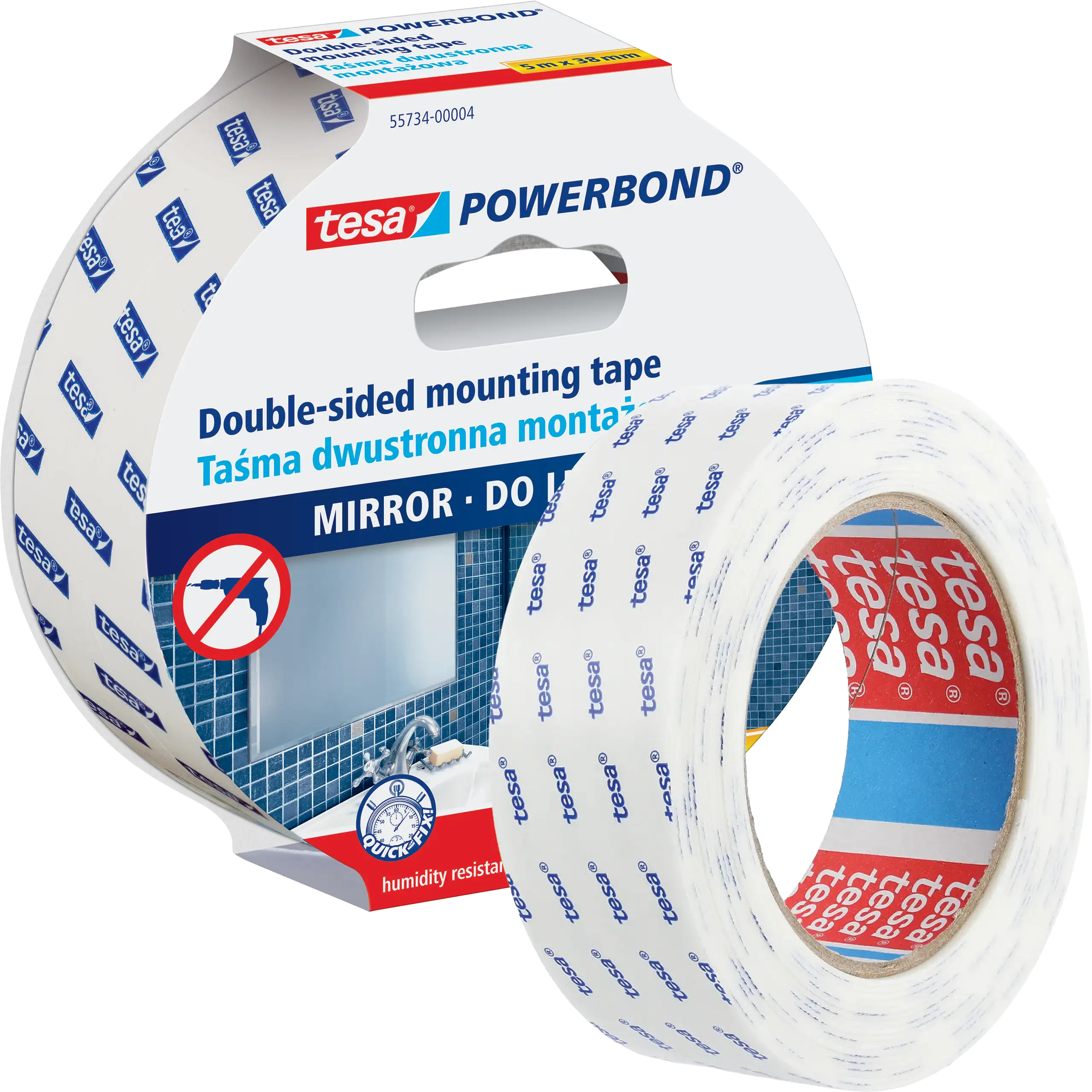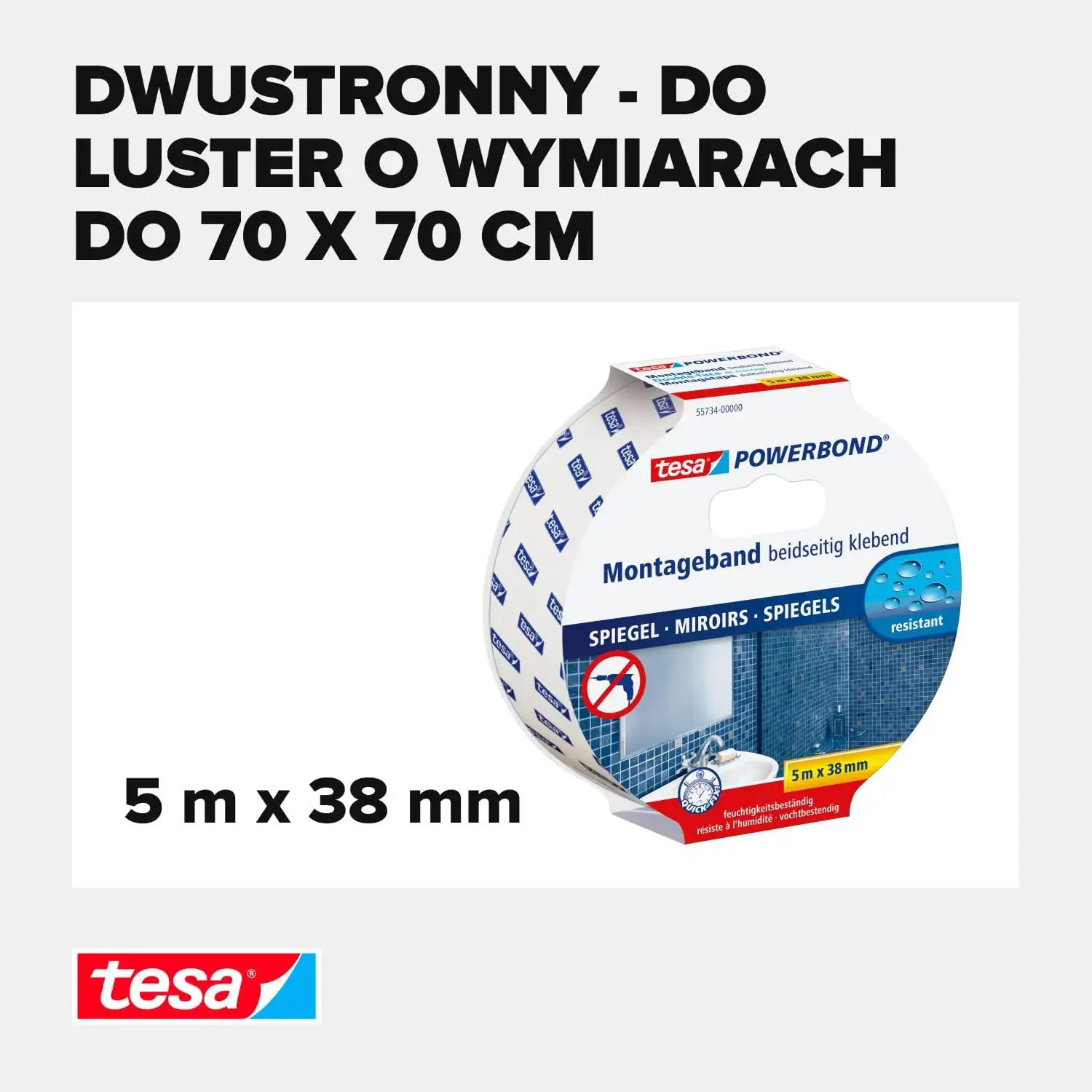 Dwustronna taśma montażowa tesa® Powerbond zapewnia wyjątkową siłę klejenia , pozwalając zamontować lustra bez użycia śrub czy kołków .