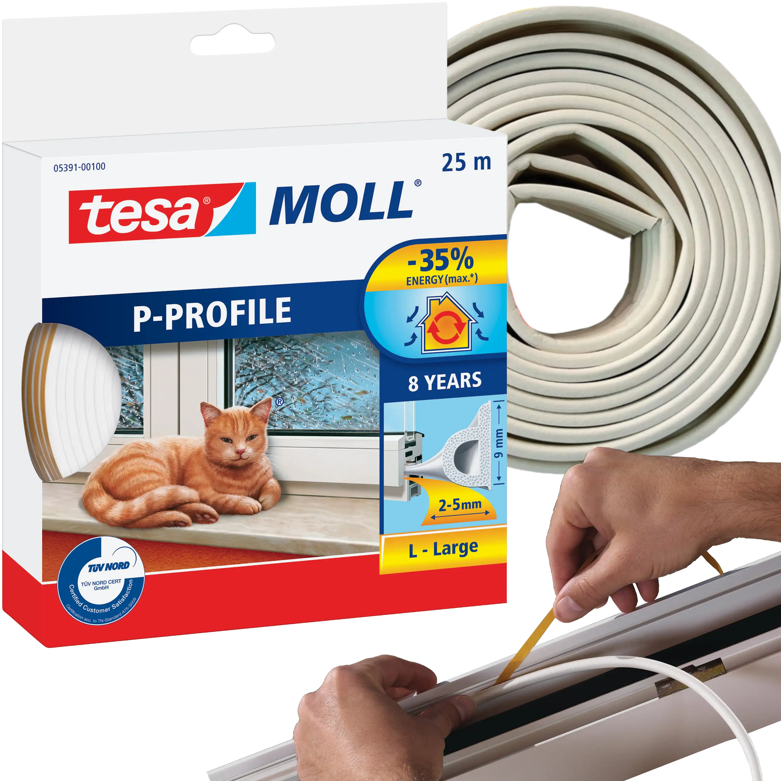 tesamoll® P-Profile jest samoprzylepnym uszczelniaczem okiennym, który montuje się bez dodatkowych narzędzi. Dzięki elastycznej konstrukcji z EPDM gumy piankowej idealnie dopasowuje się do ram, umożliwiając szybkie i precyzyjne zakrycie szczelin.