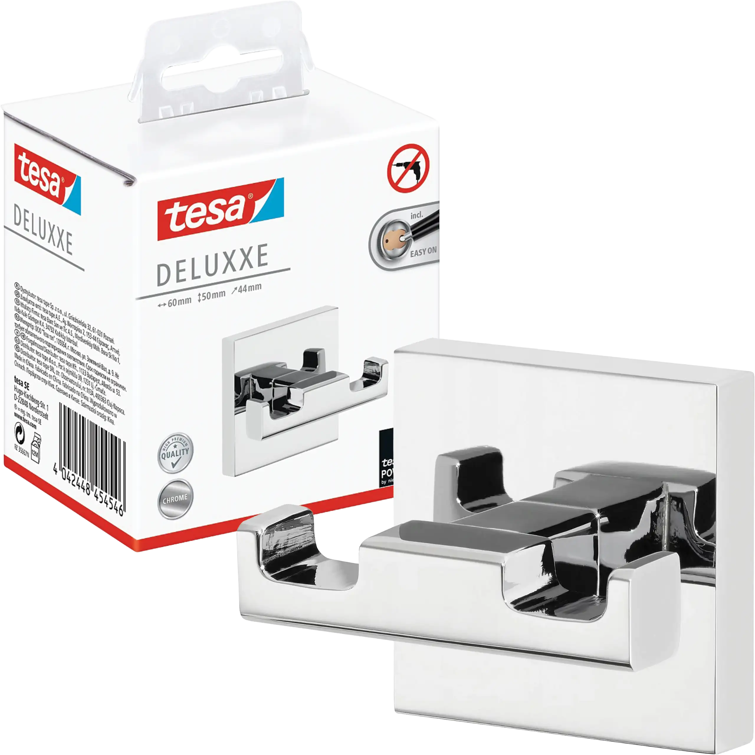 tesa® Deluxxe to akcesorium stworzone z dbałością o każdy szczegół, które łączy estetykę i funkcjonalność. Prostokątna forma uchwytu w połączeniu z chromowanym wykończeniem nadaje wnętrzu nowoczesny, designerski charakter. To nie tylko praktyczny element łazienki, ale również stylowa ozdoba, która podkreśla indywidualny klimat pomieszczenia.