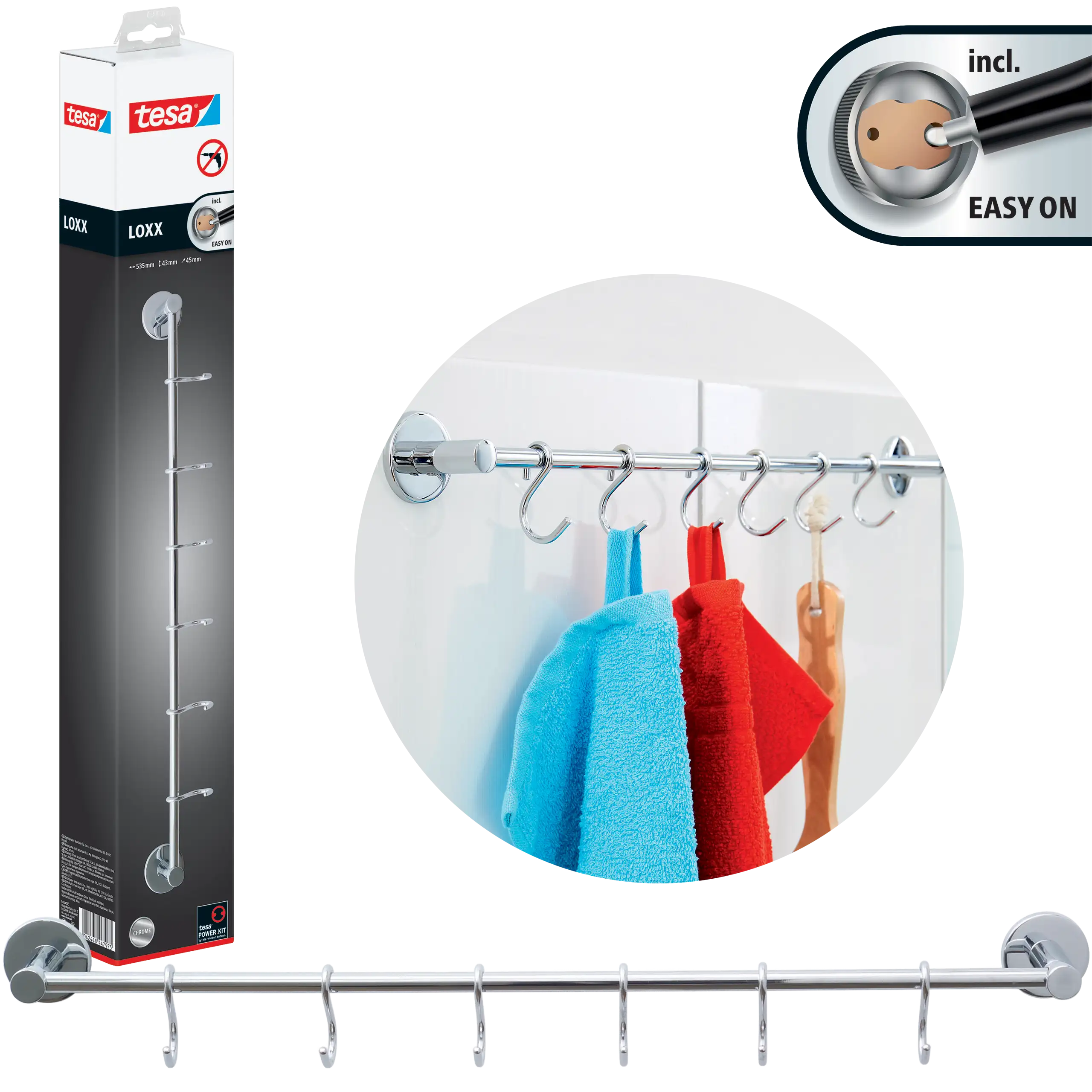 Technologia tesa® Power.Kit umożliwia solidne mocowanie bez potrzeby używania wiertarki. Produkt można zamontować na większości gładkich powierzchni, takich jak płytki, szkło czy metal. Dzięki temu instalacja przebiega szybko i bezproblemowo, a ściany i płytki pozostają nienaruszone.