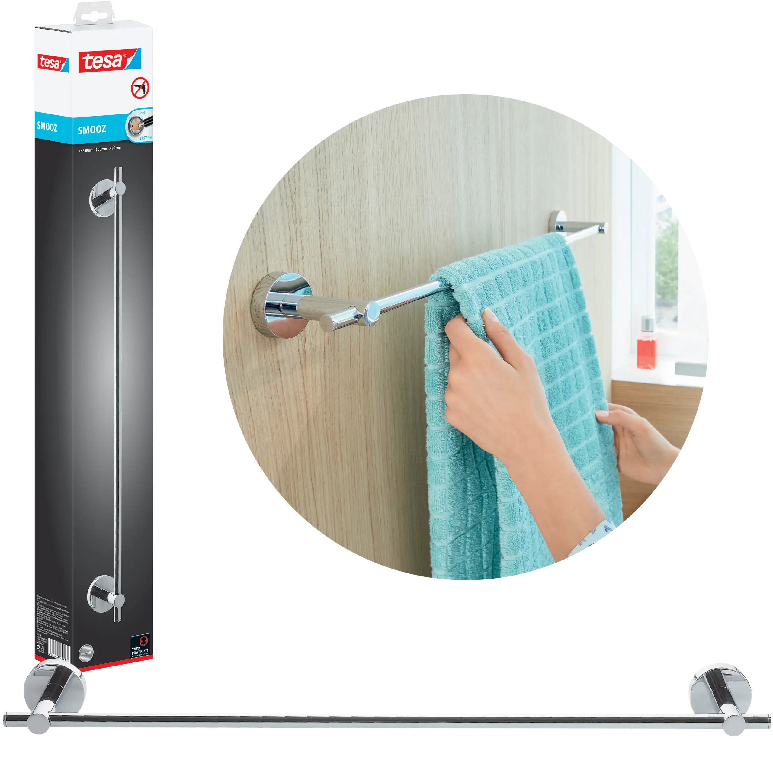 Każdy produkt tesa® Smooz montowany jest za pomocą technologii tesa® Power.Kit, co oznacza instalację bez wiercenia, bez narzędzi i bez ryzyka uszkodzeń powierzchni. Masa klejąca zapewnia pewne i trwałe mocowanie, a po 12 godzinach schnięcia uchwyt czy wieszak jest gotowy do użytku. To wygodne i nowoczesne rozwiązanie do każdej łazienki.