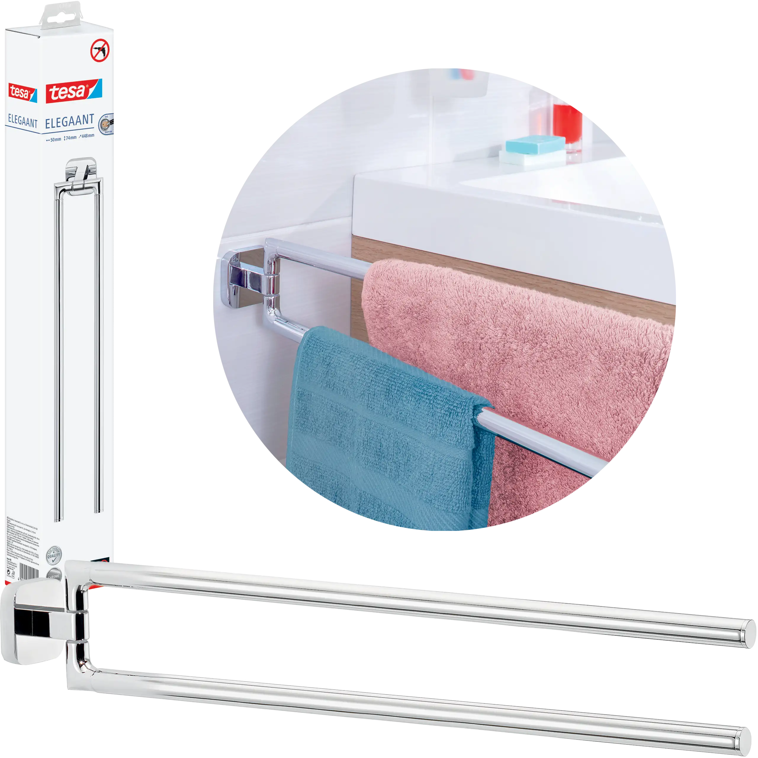 tesa® Elegaant wyróżnia się unikalnym połączeniem prostoty i wyrafinowania . Kwadratowa forma z delikatnie zaokrąglonymi narożnikami i chromowanym połyskiem sprawia, że uchwyt staje się ozdobą każdej łazienki.