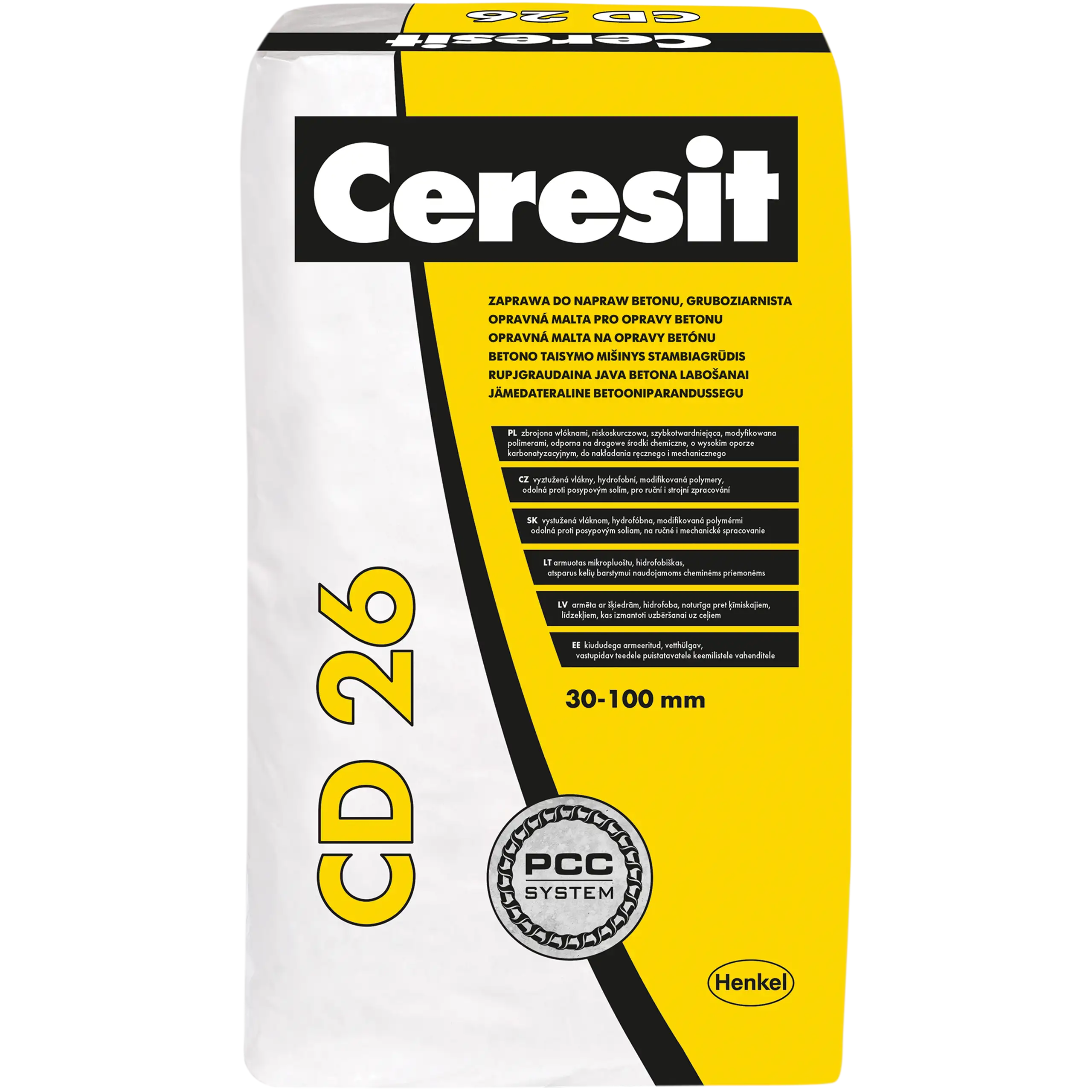 Ceresit CD 26 to gruboziarnista zaprawa naprawcza do stosowania w warstwach od 30 do 100 mm. Dzięki zbrojeniu włóknami i modyfikacji polimerami charakteryzuje się wysoką przyczepnością oraz odpornością na uszkodzenia mechaniczne. Przeznaczona do napraw konstrukcji o dużych ubytkach – balkonów, stropów, wsporników czy dźwigarów.